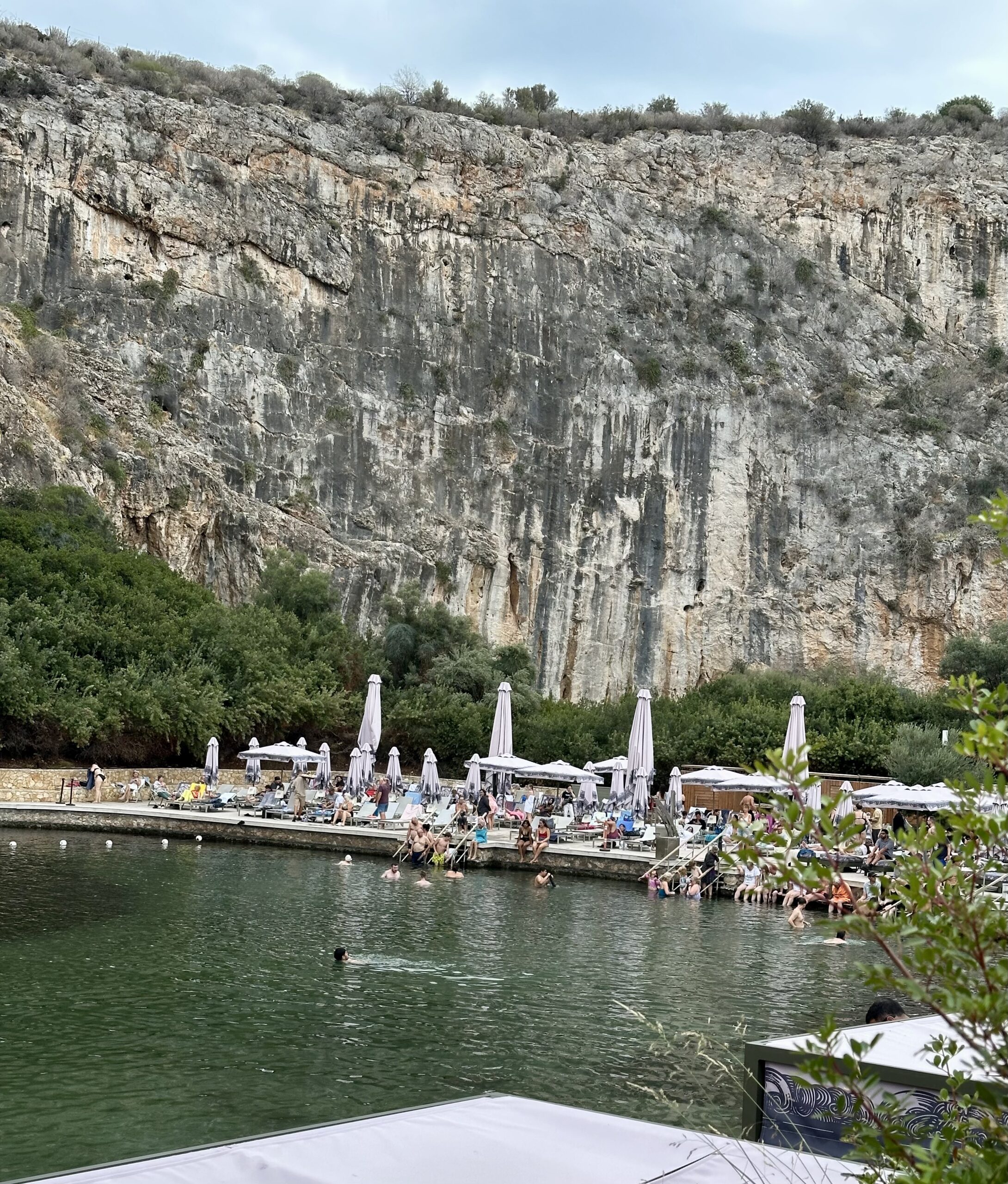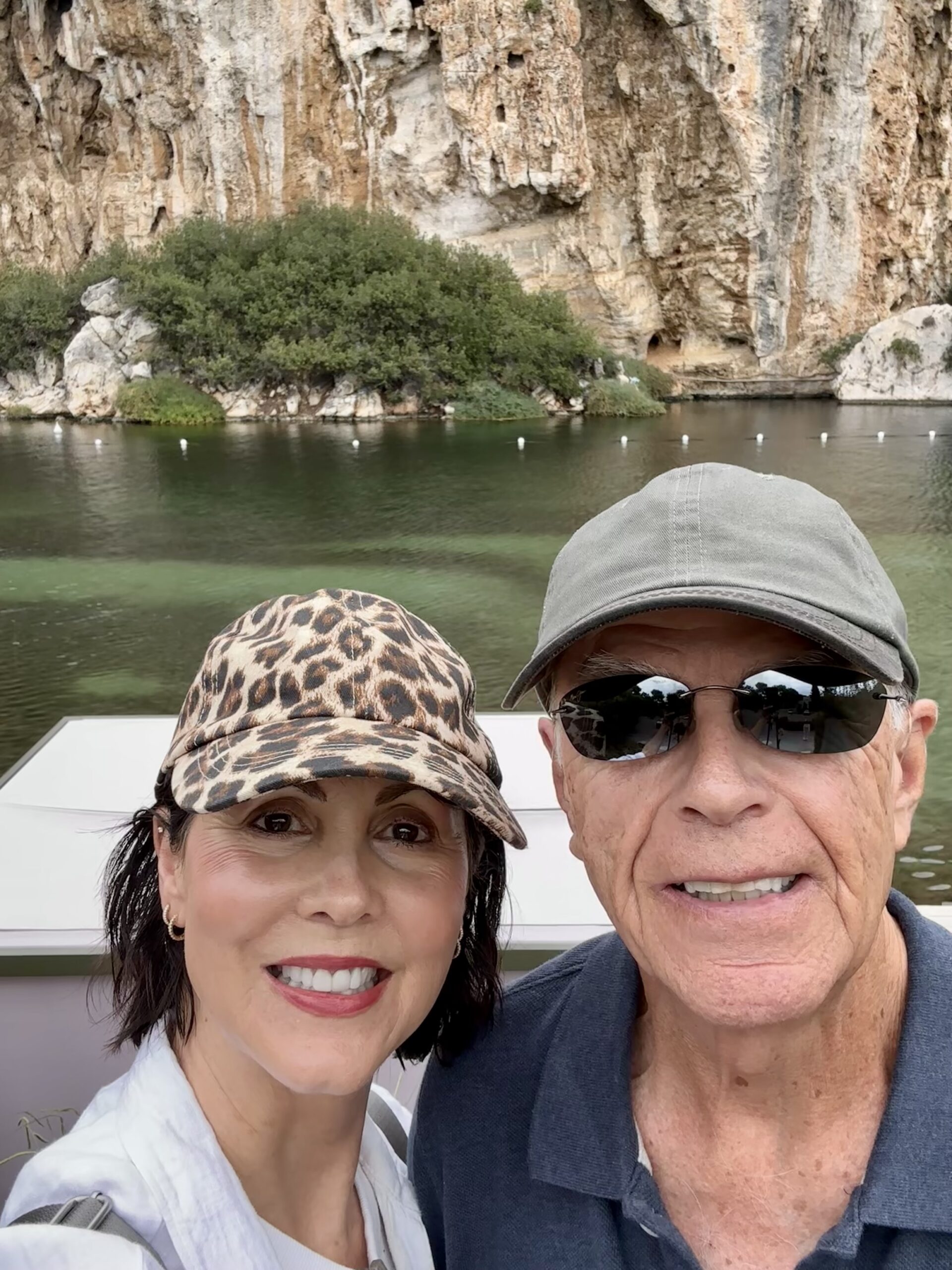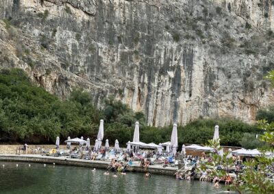 The first few days we spent going into the city— but we had a free day! So Michael and I decided to hob-knob around the ritzy neighborhood. What we learned was that many of the beaches are semi-private in that they are beach clubs where guests pay for the privilege of parking, renting a cabana, have access to chairs, snacks and drinks and of course, swimming in the sea. There is also a small nature spring lake — Lake Vouliagmeni. It’s also private with a beautiful restaurant and cabanas surrounding the perimeter. We elected not to go in the water because Michael forgot his bathing suit and contrary to popular belief, the Greek do where them in public areas. So off we went to the Four Seasons, the crown jewel of this area. The key to resort crashing is you just act like you’re staying there — even though it was probably painfully evident that we weren’t— given our lack of designer shoes and clothes, perfectly coiffed hair and an attitude of arrogance and entitlement. Some how we squeaked by and got a wonderful tour around the property by a delightful employee who assumed we had just checked in. We were wowed by the cyberlike super yachts parked in the inlet, the three pools (one was natural ocean water with sand) and the four restaurants. We walked along the boardwalk that circles the private cove, stopped at the bar for some water and when we tried to pay we were told it was complimentary. Nice. After 6.5 miles we were back to our accommodations and had our last dinner on the Riviera sitting on the sand watching the sun go down. Tomorrow we are off to Delphi and The Meteora.